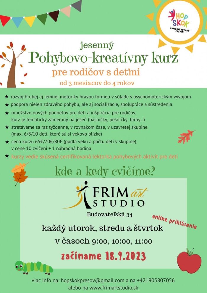 V jesenných kurzoch budeme v sprievode pesničiek a básničiek prostredníctvom hier a pohybových aktivít  s rôznymi pomôckami  aj bez nich rozvíjať nielen zdravý pohyb, ale aj jemnú motoriku  kreativitu sociálne zručnosti  sústredenie  a spoluprácu  Hravou formou tak môžete podporiť všestranný rozvoj svojho dieťatka v súlade s jeho psychomotorickým vývojom samozrejme pod dohľadom skúsenej certifikované lektorky.