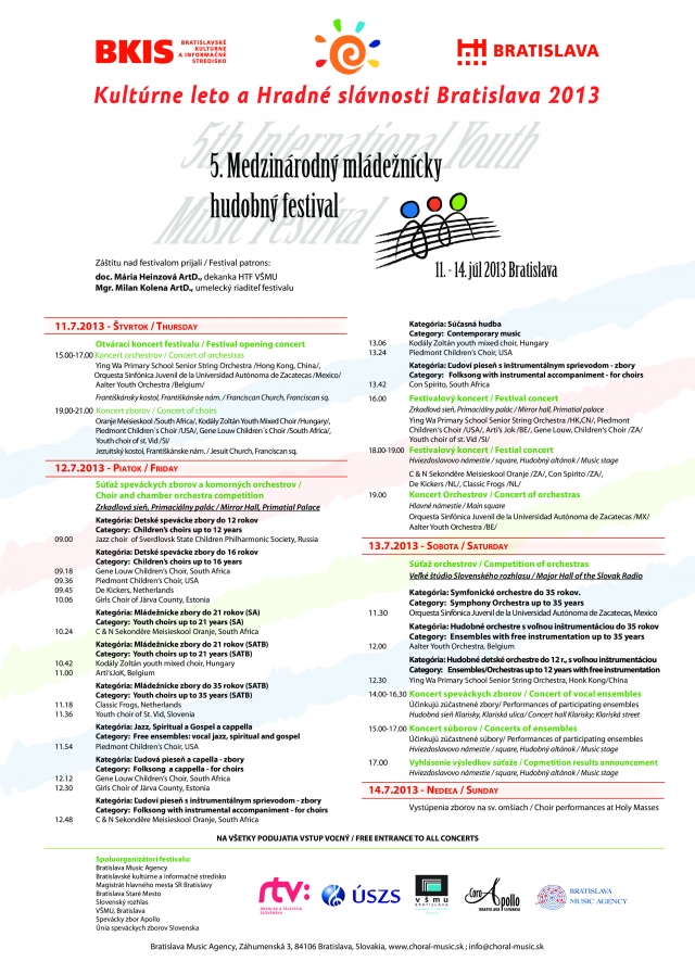 Hlavné mesto Slovenskej republiky Bratislava otvára svoje brány a pozýva spevácke zbory a orchestre do hudobného historického centra Bratislavy. Ide o jediný hudobný mládežnícky festival na Slovensku, ktorý sa naplno otvoril takmer všetkým možným hudobným prejavom detí a mládeže od klasickej zborovej a orchestrálnej hudby cez spirituál, gospel, jazzové orchestre, bicie ensemble, big band orchestre. Takto sa na Slovensku vytvoril priestor pre hudobnú mládež, ktorá koncertnými vystúpeniami dala najavo, že vie priniesť zaujímavú hudobnú kultúru na koncertné pódia. Nejde tu len o medzinárodný charakter festivalu, ale aj celosvetový charakter, pretože už minulý rok sme mohli byť svedkami inšpiratívnych vystúpení čínskych orchestrálnych súborov ktoré nám ukázali nové dimenzie ponímania interpretácie jednotlivých hudobných žánrov na vysoko profesionálnej úrovni.