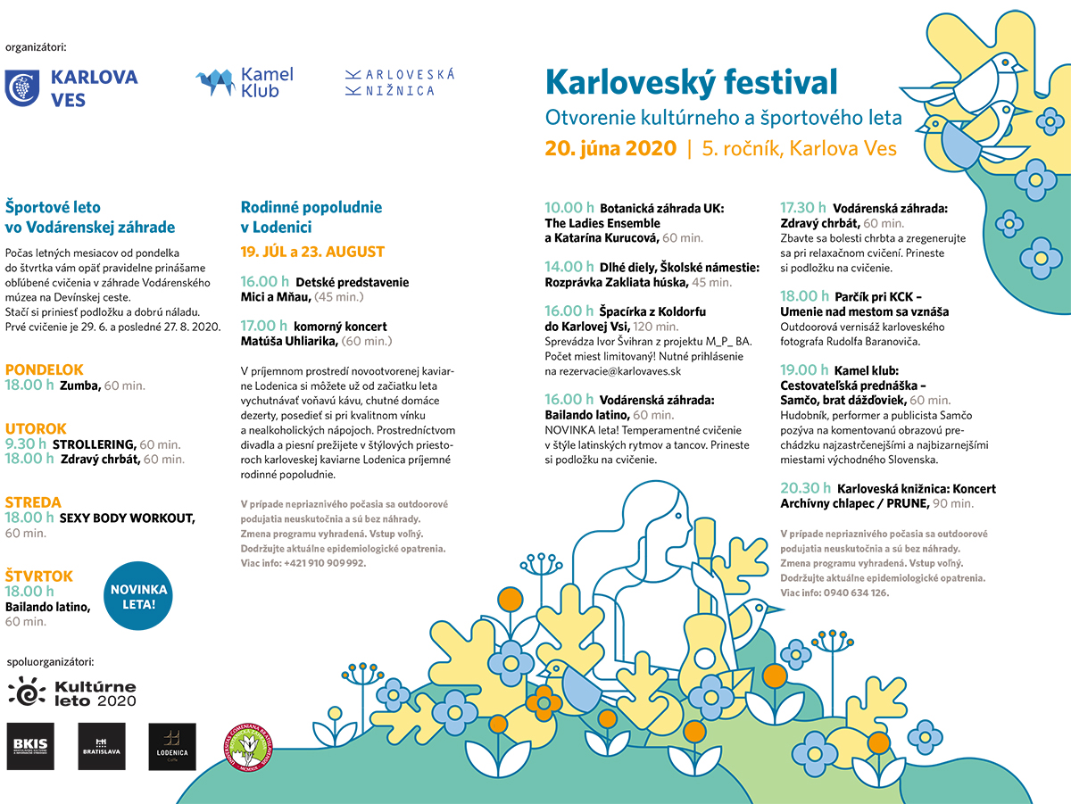 S veľkou radosťou by sme Vás chceli privítať na Otvorení 5. ročníka Karloveského kultúrneho a športového leta. Prečkali sme dlhé chvíle iba s online dávkami kultúry, ale už sa konečne môžeme stretnúť naživo a užiť si umenie naplno!