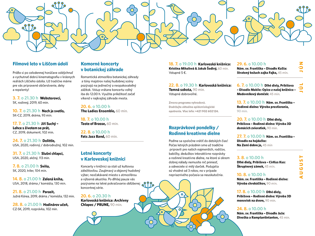 V prípade nepriaznivého počasia sa outdoorové podujatia neuskutočnia a sú bez náhrady. Zmena programu vyhradená. Vstup voľný. Dodržujte aktuálne epidemiologické opatrenia. Viac info: 0940 634 126.