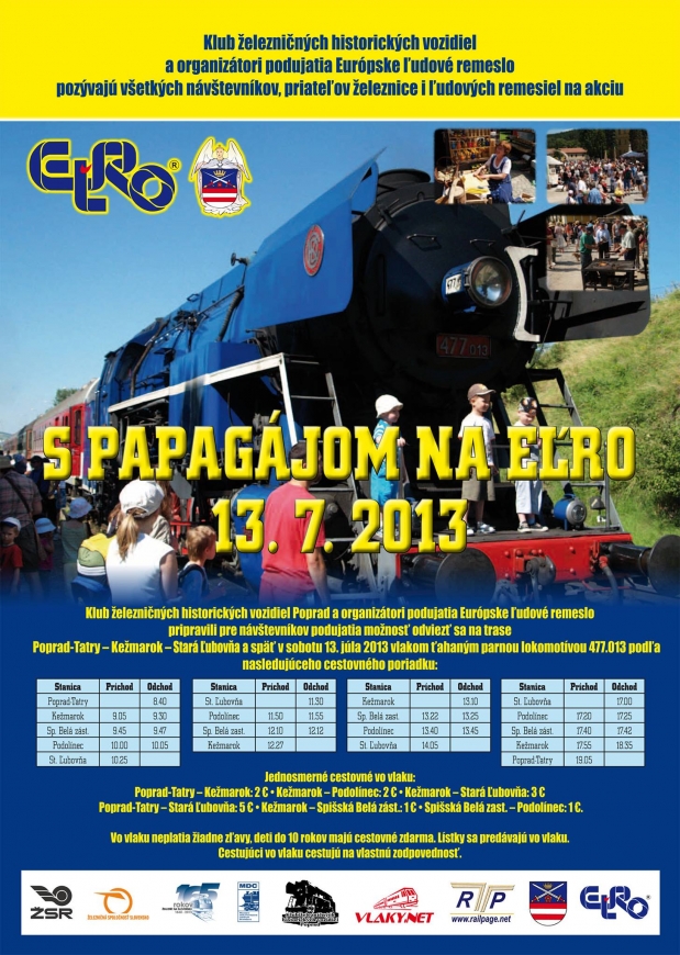 Klub železničných historických vozidiel Poprad a organizátori podujatia Európske ľudové remeslo 2013 pripravili pre všetkých návštevníkov, priateľov železnice i ľudových remesiel možnosť odviesť sa na Poprad-Tatry – Kežmarok – Stará Ľubovňa a späť v sobotu 13. júla 2013 historickým vlakom ťahaným lokomotívou 477.013 “Papagáj”.